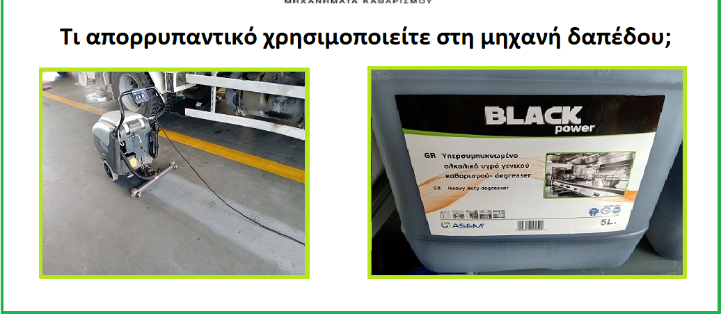 Δεν είναι όλα τα απορρυπαντικά κατάλληλα για μηχανές δαπέδου. Σε συνεργασία με το κατάλληλο απορρυπαντικό και τη βούρτσα ή την τσόχα του μηχανήματος καθαρισμού το αποτέλεσμα είναι άριστο όπως φαίνεται στην αριστερή εικόνα. Σε εμάς θα βρείτε κατάλληλα απορρυπαντικά για μηχανές δαπέδου προστατεύοντας έτσι τη κατάσταση του δαπέδου και διασφαλίζοντας την ομαλή λειτουργία του μηχανήματός σας.
